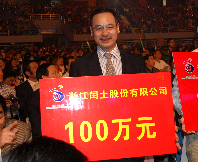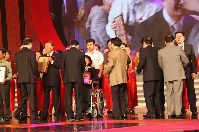 10月11日,阮加春總經理在第八屆全國殘運會倒計時一周年大型愛心助殘晚會上接受中國殘聯(lián)主席張海迪(坐輪椅者)頒發(fā)“愛心企業(yè)”獎牌。浙江省省長呂祖善等領導出席了本次活動。